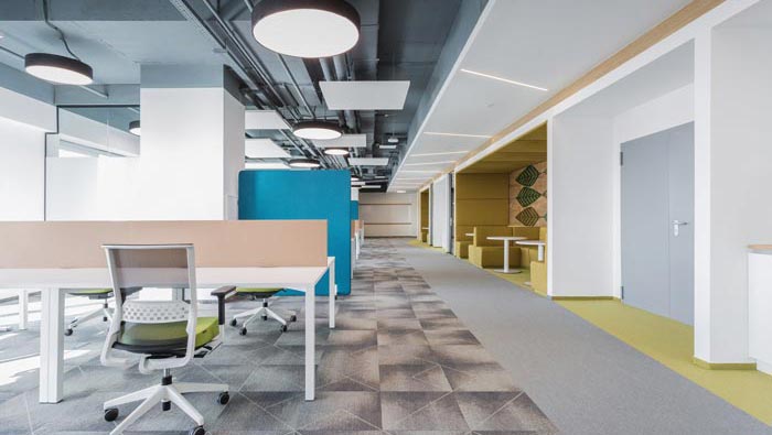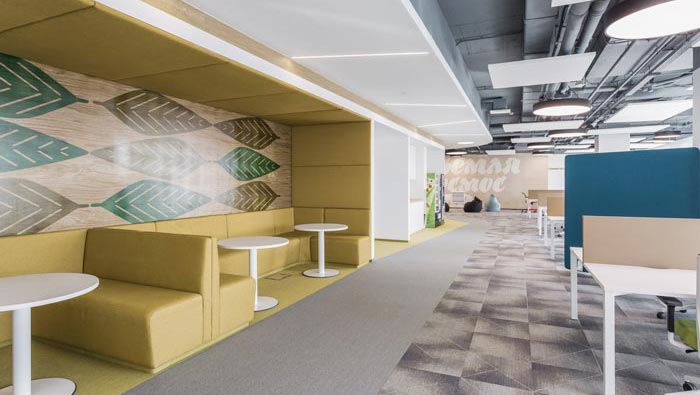 過道結合部的設計:此處為整個企業的內部交匯點,在此處過道呈四面八方式分布,不管走哪一個方向都可以繞回原地,這也是一個大回型動線設計,故此設計師在設計中在此地開辟出一片如凈土般的區域,以軟裝進行鋪墊,讓員工、客戶在此處可以休息、娛樂,可增可減的沙包型座椅,也在無形中成為一處亮點。
