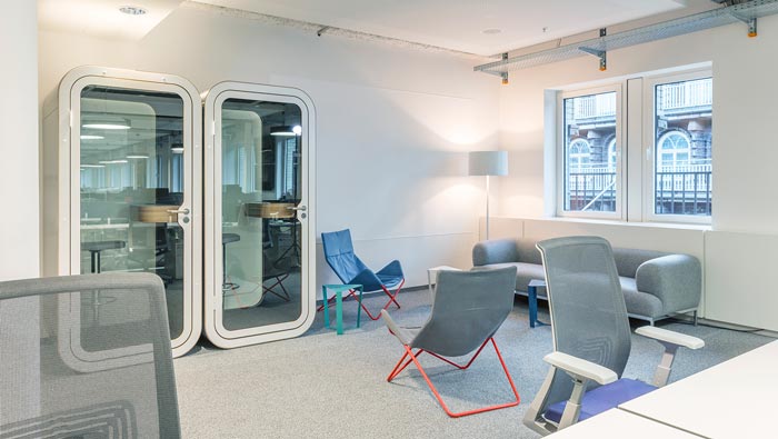 休息區(qū)域的設(shè)計(jì):在休息區(qū)域的設(shè)計(jì)中,設(shè)計(jì)師并沒有固定一個(gè)獨(dú)立的空間,而是在辦公區(qū)域的后方留下了一篇活動(dòng)區(qū)域,在這里最引人矚目的就是兩個(gè)長方形的柜體,這樣的柜體主要作用就是封閉的打電話柜,當(dāng)員工有電話的時(shí)候可以在這里面進(jìn)行接聽與交流,在保證通話的同時(shí),也不會(huì)對(duì)外界有任何影響。