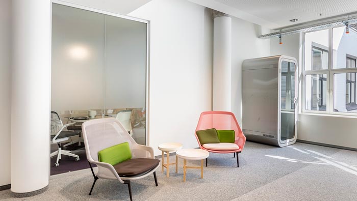 會(huì)議室的設(shè)計(jì):企業(yè)的文化就是任何問題都在內(nèi)部解決,所以對(duì)于會(huì)議室就有很高的要求,此處僅為空間的冰山一角,設(shè)計(jì)師利用了一個(gè)小小的物件——轱轆,就讓整個(gè)空間擁有了活性,空間可以根據(jù)需求自主的形成每一個(gè)形狀,一切都是可操作性的,代行會(huì)議室只需要將桌子進(jìn)行重組就可以,方便又便捷。