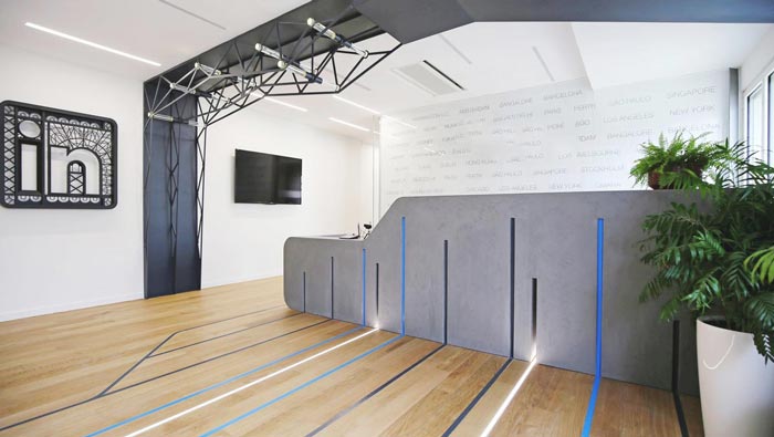 前臺的設計:客戶進入空間之后,首先看到的就是一條條射線,這也是設計師有意為之,當客戶看到射線之后眼睛就是不由自主的跟隨,當射線結束的時候客戶剛好走到前臺,這樣可以很好地起到視覺引導的作用,運用線型的吸引,引導客戶到達指定的位置。