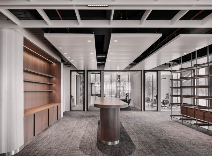 這是一個金融行業的辦公室,在這個3200方的辦公室中,公司在不同領域的相關部門被設計在一起,而工作空間則以線性規劃方案布置。