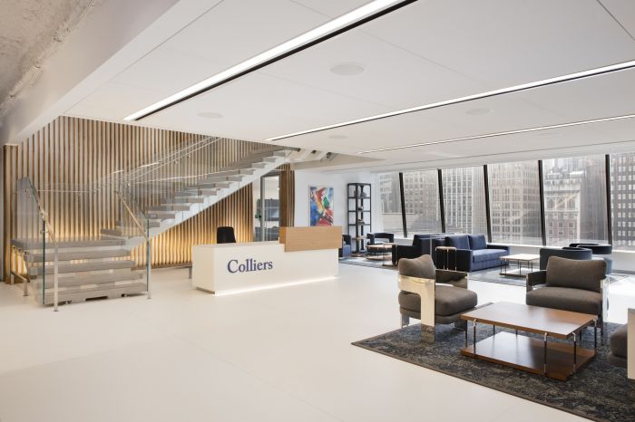 這是一個5500方的辦公室,整體空間寬敞明亮。整個空間設計都凸出體現了公司的品牌,同時還采用了極簡主義的色調和紋理。大理石面板從電梯大廳一直延伸到白色、淺灰色和藍色的輕盈背景中。