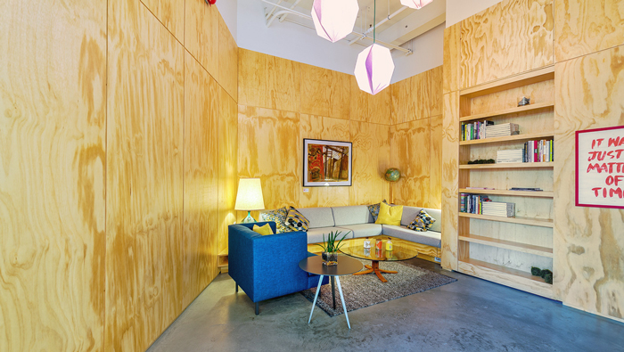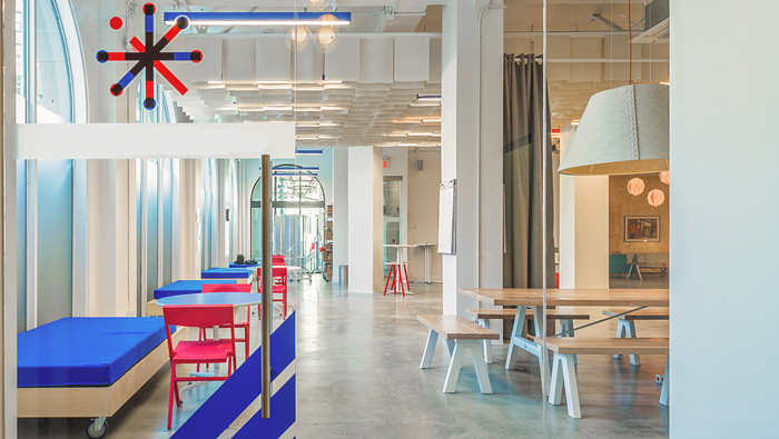 交流區(qū)域的設(shè)計(jì):當(dāng)桌椅收攏起來之后,此處空間就擁有了更多的可能,這也是設(shè)計(jì)師設(shè)計(jì)的初衷,椅子被懸掛在墻體之上,儲藏柜按照層級依次向上,一方面可以在此處休息,另外一方面也為掛取椅子提供了保障,可折疊的桌子以此排列在儲藏柜的左側(cè),當(dāng)桌椅被收攏之后,被設(shè)計(jì)師巧妙的設(shè)計(jì)為空間的點(diǎn)綴物。