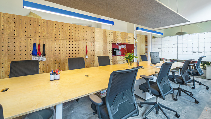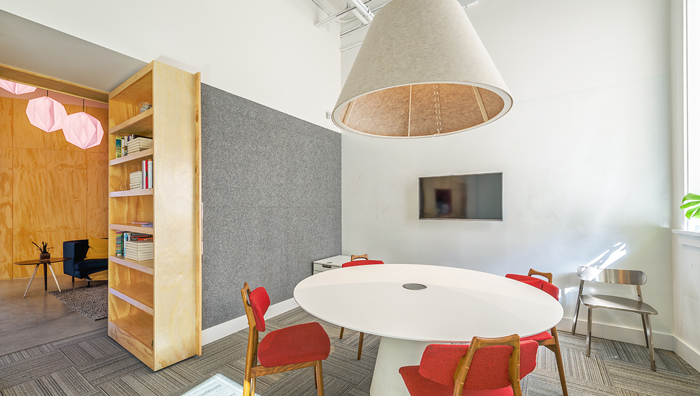 小型會議室的設(shè)計(jì):我們首先看到的就是一個機(jī)關(guān)門,在外看是一個書架,往內(nèi)推開卻是另有一番天地,這也是設(shè)計(jì)師設(shè)計(jì)中的一點(diǎn)點(diǎn)小趣味,在設(shè)計(jì)師看來趣味是辦公中的調(diào)劑,設(shè)計(jì)師希望員工在辦公中不是一成不變的,而是幽默、活躍、有趣。