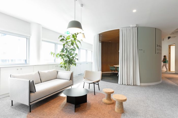 這是一個700方的辦公室,業主是一家從事醫藥行業的公司。設計師把工作區分為三個區域:一個安靜的區域,員工可以進行個人工作;一個動態區域,員工可以單獨工作或者與同事互動;以及一個協作區域,團隊可以在這里進行會議,進行團隊討論。