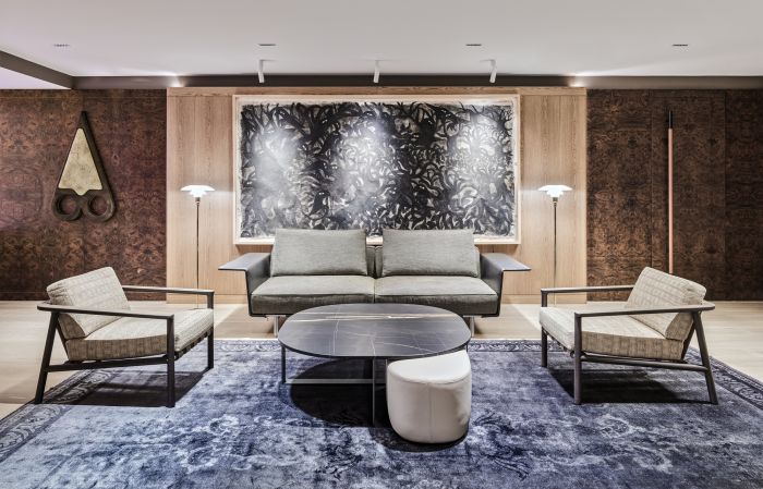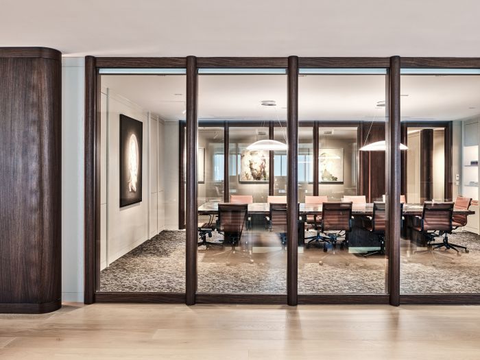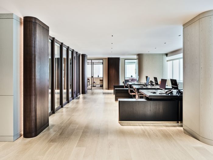 所有的辦公室都是開放式設(shè)計,透明玻璃門劃分了工作區(qū)域。從接待區(qū)到工作區(qū),木材材料逐漸使用,所以整個辦公室的調(diào)色板以米色和棕色為主。該項目的主要棕色色調(diào)以木質(zhì)元素和 大理石細節(jié)為特色。