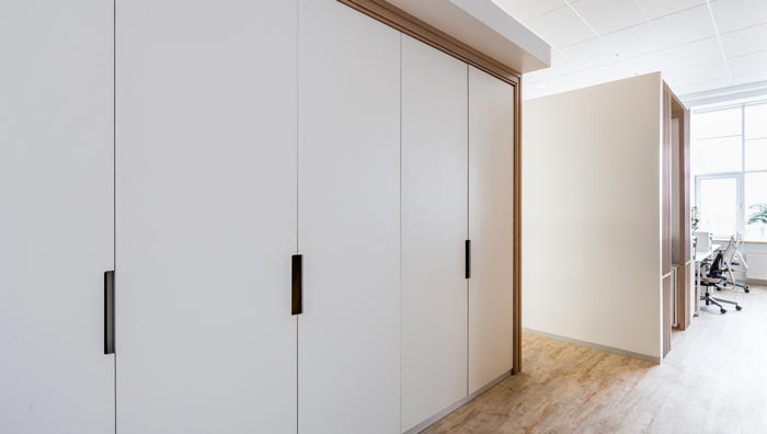 工具間的設計:設計師舍棄了一個工位,將其打造成工具間,這樣設計的好處就是在不影響格局的前提下,將每一個區(qū)域都安排的恰如其分,同時此處也位于空間的中央,在無形上提升了工作的效率,設計師需要做的就是在滿足需求的同時,并逐漸優(yōu)化、細化設計。