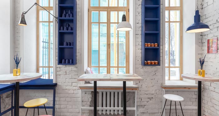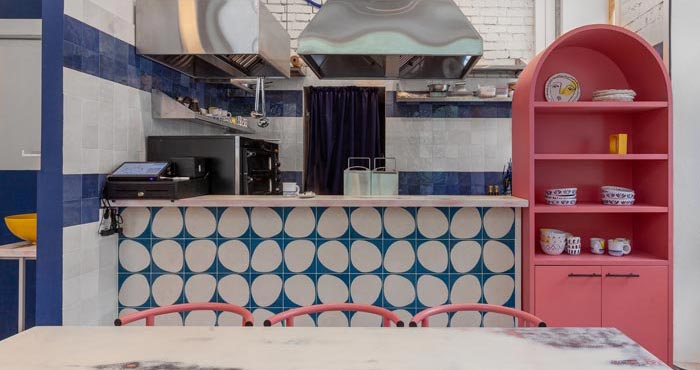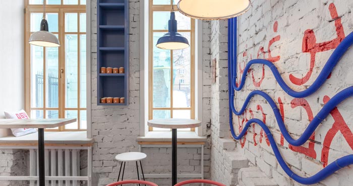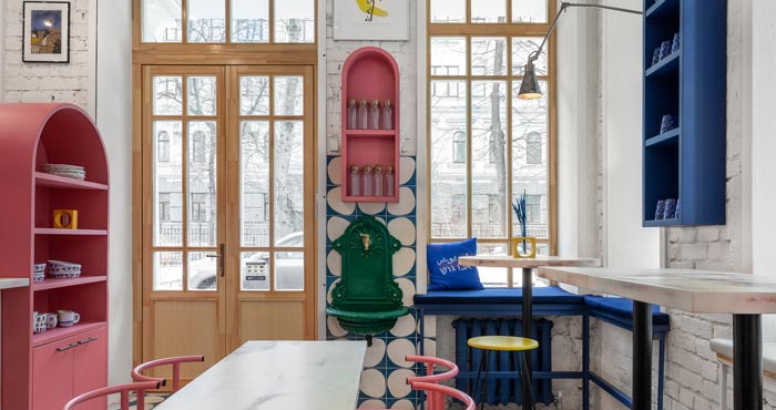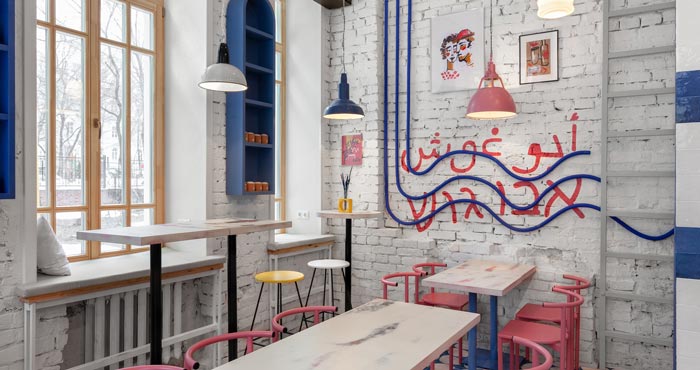 本次街頭餐廳設計方案介紹結束,在一個面積不大空間中,必須容納一個開放式廚房,大廳內部高而明亮的空間設計,用鮮艷的色彩點綴整個餐廳。