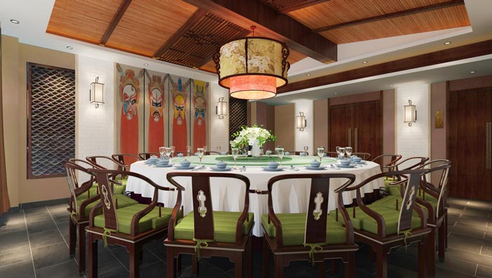 川菜館三樓包廂裝修設(shè)計:這里可以坐下16個人,這里適合公司之間、一大家子之間的聚餐,這里的氛圍是餐館的競爭優(yōu)勢所在,設(shè)計師希望這里菜肴絕佳、氛圍絕佳、服務(wù)絕佳。