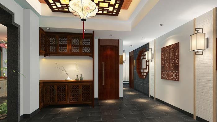 川菜館二樓玄關(guān)裝修設(shè)計:客戶經(jīng)過樓梯進入玄關(guān),經(jīng)過玄關(guān)進入客房,一環(huán)套一環(huán),古色古風(fēng)的設(shè)計在空間中延續(xù),目的就是空間有一種,自始至終的感覺,給客戶以安心。