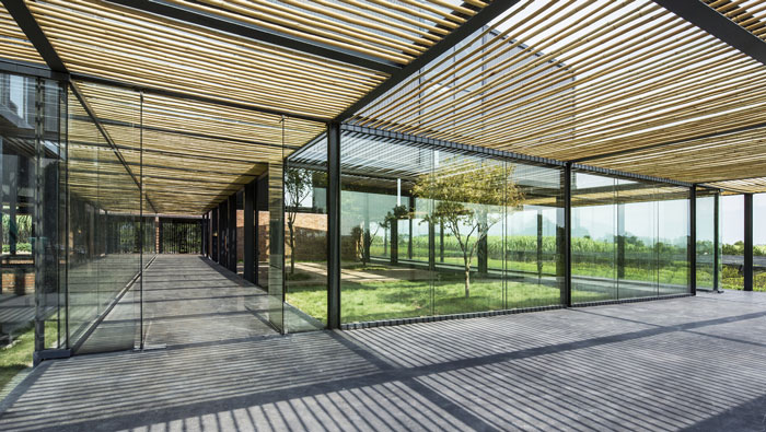 紅糖廠房外部進(jìn)門區(qū)裝修設(shè)計:這里是連接進(jìn)門處、和外部的區(qū)域,連廊的設(shè)計即可以抵擋陽光,同時又保證了空間的通透,木材都是做過防水處理的,這樣可以保證內(nèi)部綠植的生長。