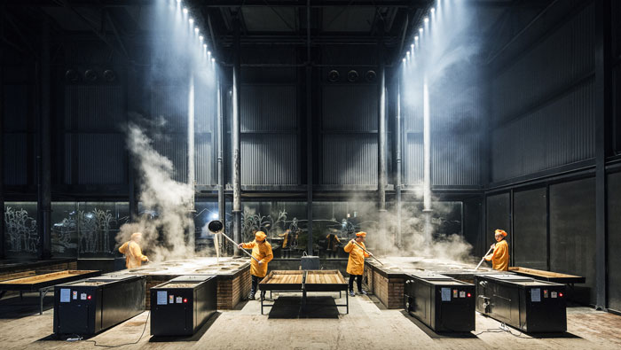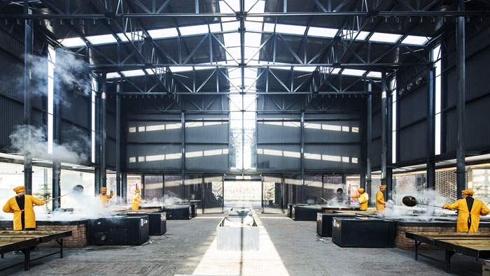 紅糖廠房車間細(xì)節(jié)裝修設(shè)計:這里強(qiáng)調(diào)的是對煙霧的處理,看似垂直向上的煙霧,實(shí)則也是設(shè)計師經(jīng)過多次研究的結(jié)果,設(shè)計師考慮到煙霧對工作人員的影響,故此重點(diǎn)解決。