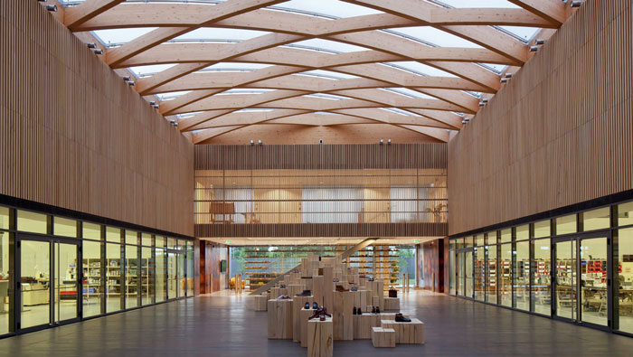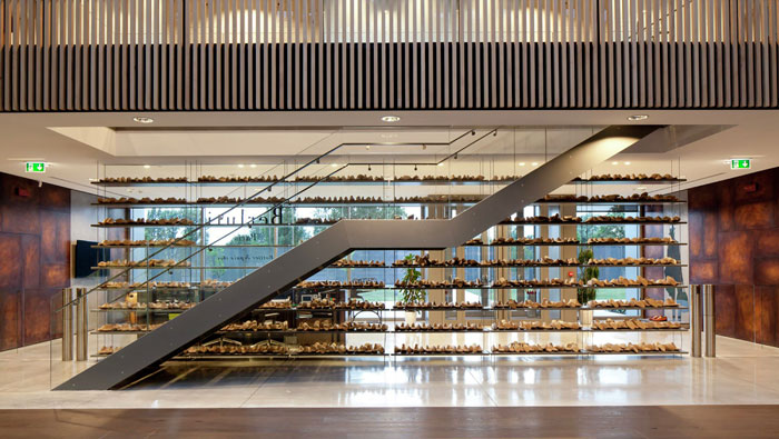 工廠廠房大堂裝修設(shè)計(jì):進(jìn)入大堂后,可以看到這里擺放著各式各樣的樣板鞋,這里既做為展示區(qū),同時(shí)也做為樣板區(qū),一個(gè)區(qū)域多個(gè)功能,正是設(shè)計(jì)師對(duì)功能區(qū)域的定位。