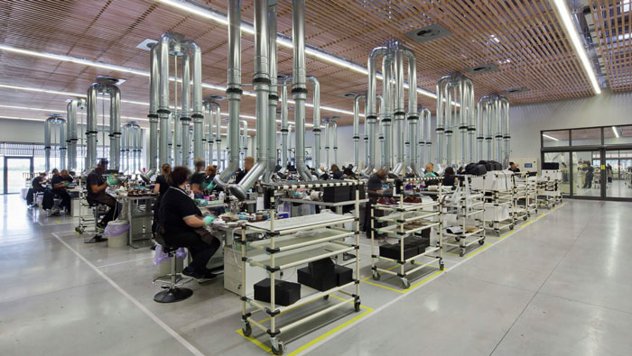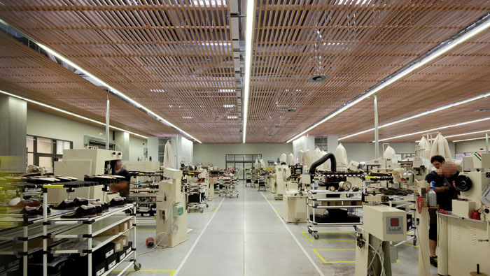 工廠廠房車間裝修設(shè)計(jì):這里是鞋子的重要組裝區(qū),這里主要由人工完成,高端的鞋子在這里逐漸成型,這里注重的是舒適度,在定制化回歸的今天,高端的鞋子更受人追捧。