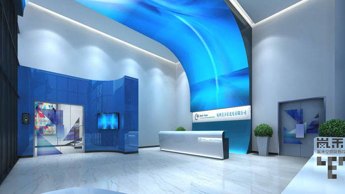 前臺大廳的設計:設計師在設計的時候,采用色彩+燈光的方式對空間進行設計,天藍色的設計會令人聯想到海空無限延伸的開放與深遠,同時天藍色也有濃濃的科技屬性,這樣與企業的屬性相融合,其次就是燈光的設計,燈光與色彩之間的相互搭配更能映襯出企業的實力,讓人產生可靠、信賴的感覺。