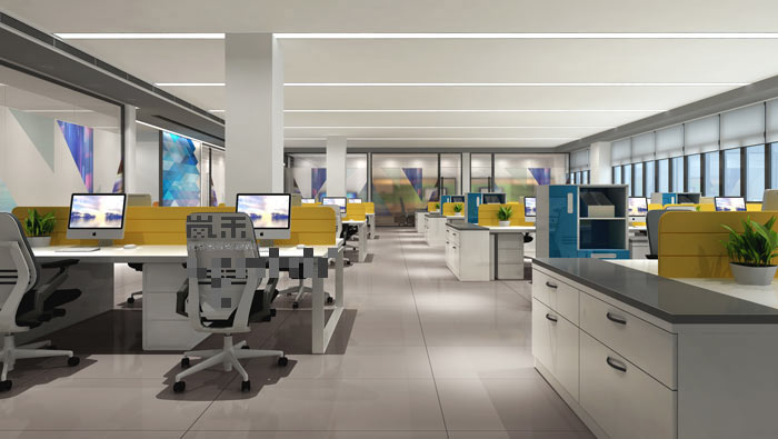 辦公區域的設計:設計師在設計的時候,將空間按照4:2:4的比例對空間進行劃分與設計,中間以動線連接各個區域,同時以動線為中心開始布局辦公區域,這樣可以做到空間的暢通無阻,同時設計師選用新型的隔斷辦公桌,這樣一來可以使空間的容納效果提高,另一方面在開放空間中為員工打造屬于個人的私人空間,做到分中有合。