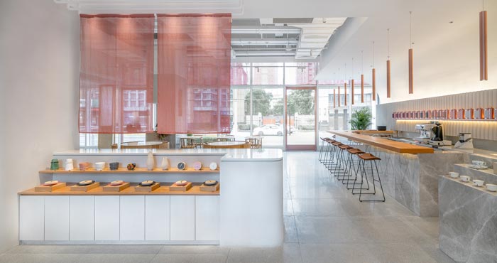 本次為茶餐廳設計項目,茶餐廳位于一個商業綜合體的室外一層,設計師希望創建一個舒緩的流線,引導人進入到一個愜意的氛圍空間。