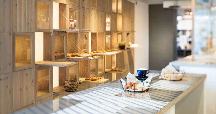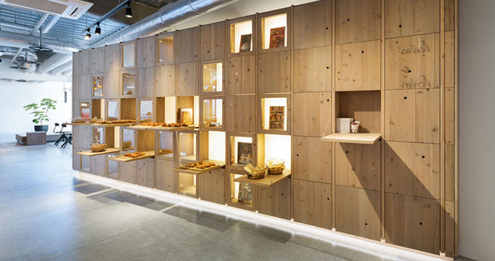 設計理念:店內色調素雅,以木質材料為主,簡約且現(xiàn)代化。選擇開放式的廚房,表現(xiàn)出所有的面包糕點都是新鮮出爐。天花板直接將設備管線裸露,各類風格迥異的吊燈設計也透露一股現(xiàn)代工業(yè)氣。提供了三種不同類型的座位:吧臺型、公共長桌型和榻榻米風格的坐席,供顧客自由選擇。設計了一個類似集裝箱的展示平臺,為了展示不同類型的點心,希望鼓勵通過這個平臺讓顧客發(fā)現(xiàn)自己想吃什么最值得一提的是,這家簡約風格的糕點店,特意為顧客設計了一塊閱讀區(qū)域,就像圖書館一樣,提供各類書籍。在享受美味的同時還能豐富精神食糧,這樣的小店雅致,美好!