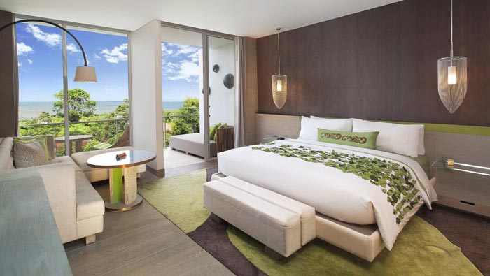 客房的設(shè)計:在這里我們感受到的是度假村美麗的景色,在這里我們離自然是那么的近,設(shè)計師在設(shè)計中也充分考慮到室外景色的引入,在設(shè)計師看來客房與戶外景色相互融合,所達到的效果絕不是簡單的1+1,而是將酒店進行了一次全新的深化,讓酒店進行一個全新的升級。