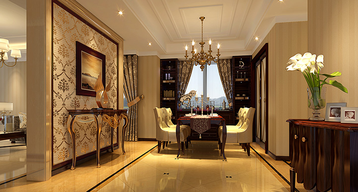 設計理念:以白色調和深啡色調為大對比色彩,加以簡約形態的暖色家具為中間色來諧調,營造一種高貴雅致對比的深度感的空間。將歐洲新古典風格演繹成一種優雅的平衡姿態,含蓄、考究的家居空間