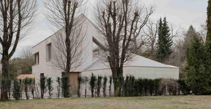 水晶體的形狀從周?chē)慕ㄖ镏械玫降撵`感,20世紀(jì)30年代的四坡屋頂矗立在大花園的一角的緊湊單體房屋。在這里,六邊形體塊是傾斜的,為在西北的車(chē)庫(kù)留出空間,并為南面留出一個(gè)寬敞的花園。平面圍繞一個(gè)菱形樓梯井展開(kāi),樓梯井是承重核心筒,并融入了中央服務(wù)軸線(xiàn)之中。房間圍繞這個(gè)中心元素布置,并且每個(gè)房間都通向不同的外部空間。