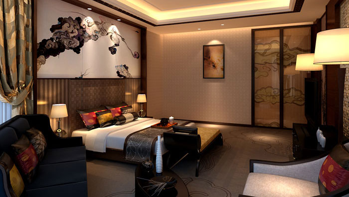 設(shè)計(jì)理念:室內(nèi)設(shè)計(jì)中,設(shè)計(jì)師將古典的壁畫與現(xiàn)代的吊燈與低垂的竹簾處處協(xié)調(diào),將濃重的顏色宣泄到底,張揚(yáng)到極致,其結(jié)果反而出奇的和諧,紅和金的富麗感無可匹敵,也讓人盡情沉醉于中國風(fēng)的視覺盛宴中。