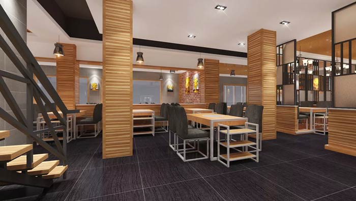 魚火鍋店一樓餐區設計:空間的柱子,設計師也為其定制了外衣,目的就是希望柱子可以融入到空間之中,色彩的變換也是讓空間更加溫馨,適合大眾化客戶的就餐眼光。
