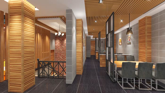 本次為魚火鍋店裝修設計方案,在實地考察的時候,了解到整個空間是兩層建筑,在設計中一樓主要由前臺、開放式就餐區構成,二樓主要由包間、以及兒童玩耍區構成,空間地面采用黑色仿古磚,墻面采用三種色彩的材質與小紅磚,讓客戶仿佛在記憶中中老房子里就餐。