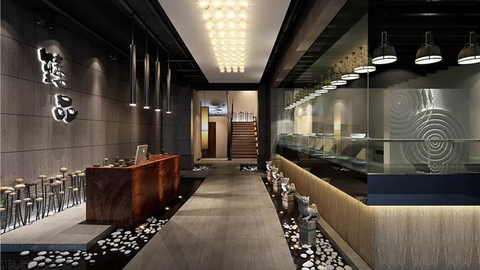 肥牛火鍋店前臺設計:整個空間分為左、中、右,左邊為前臺接待,右邊為透明廚房,中間為過道,前臺與廚房安置在對立面,是為了讓客戶吃的放心與安心。