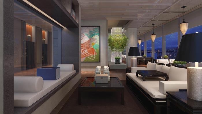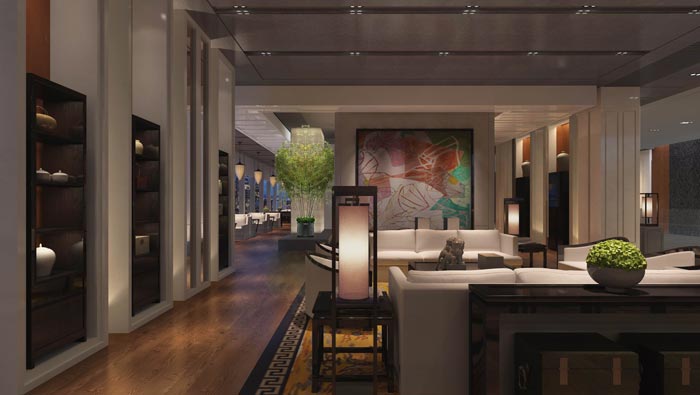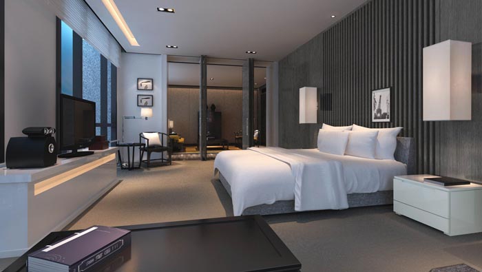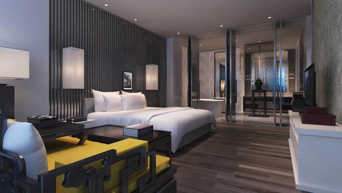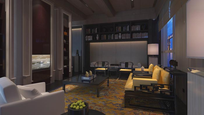 套房的設(shè)計:活動隔斷門將空間一分為二,一邊為休息區(qū)、一邊為洗浴區(qū),客戶在洗浴區(qū)褪去一身疲憊的時候,漫步走進(jìn)客房,此時活動門會慢慢的關(guān)閉,因?yàn)榇嘶顒娱T是可以遙控關(guān)閉的,設(shè)計師希望讓客戶在這里享受到自動化的服務(wù),讓客戶享受到古代元素+現(xiàn)代元素結(jié)合的空間設(shè)計。