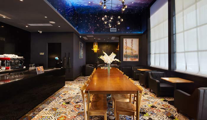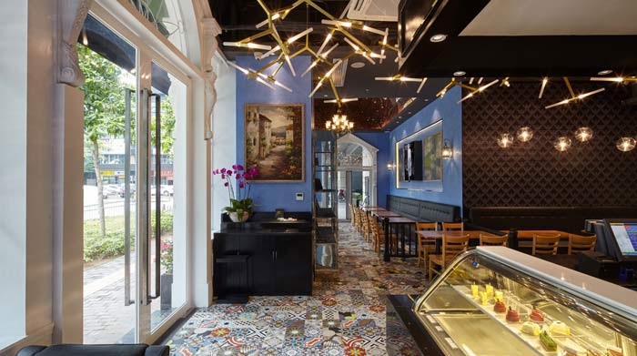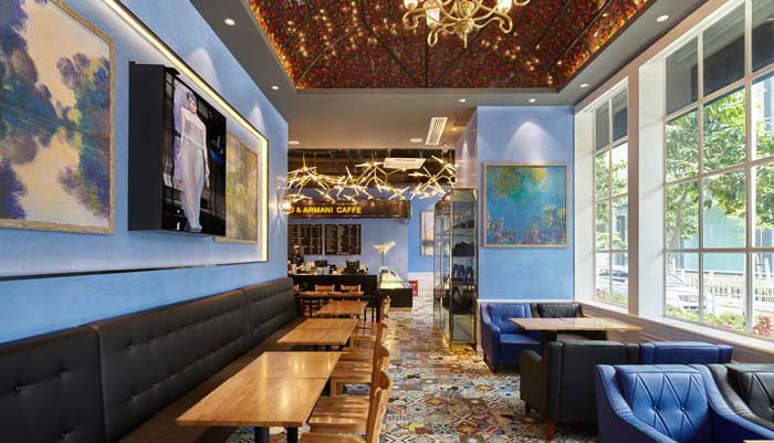 延續了英國尼祿咖啡的經典色彩,融入意大利的古典建筑元素,結合阿瑪尼的時尚、簡約設計元素,再加入繪畫藝術元素。