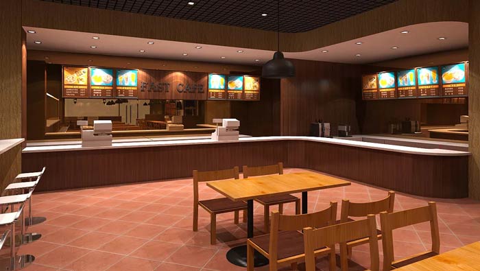 快餐店吧臺裝修設計:曲線的吧臺用來滿足客戶在這里打菜,同時曲線的設計也拉長了距離,讓打菜的隊伍不至于扎堆,一點一點穩步前行,讓秩序成為一種習慣。