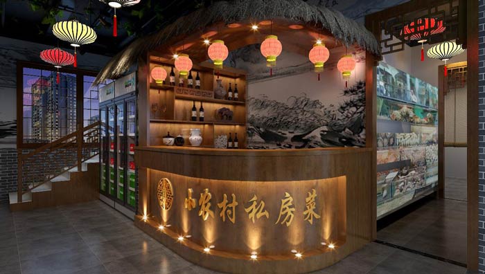 農家私房菜進門區(qū)設計:小農村私房菜,六個字給客戶以直觀的感受,鄉(xiāng)村樣式的柜臺、加上中式的元素,讓時間在這里慢了下來,讓客戶享受美食真正的味道。