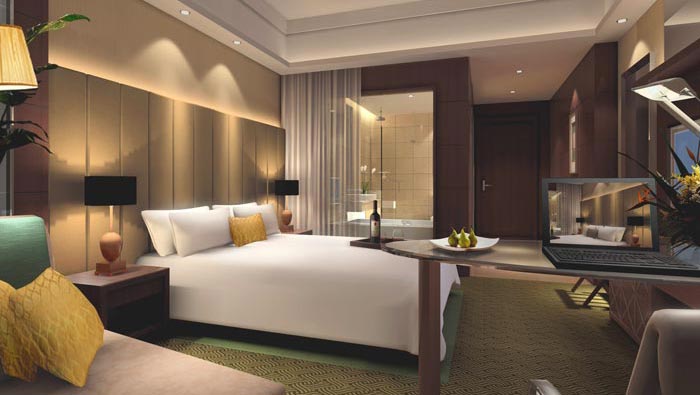 商務(wù)大床房的設(shè)計(jì):此處屬于酒店的標(biāo)準(zhǔn)間,在這里顧客可以辦公與休息,但是此處的辦公環(huán)境不同,讓顧客在愉悅的氛圍中辦公,并支持辦公的各種輸出,以此解決客戶(hù)的后顧之憂(yōu),當(dāng)顧客品著一杯紅酒休息和辦公,相信這樣的一種氛圍對(duì)人來(lái)說(shuō)本身就是一種享受。