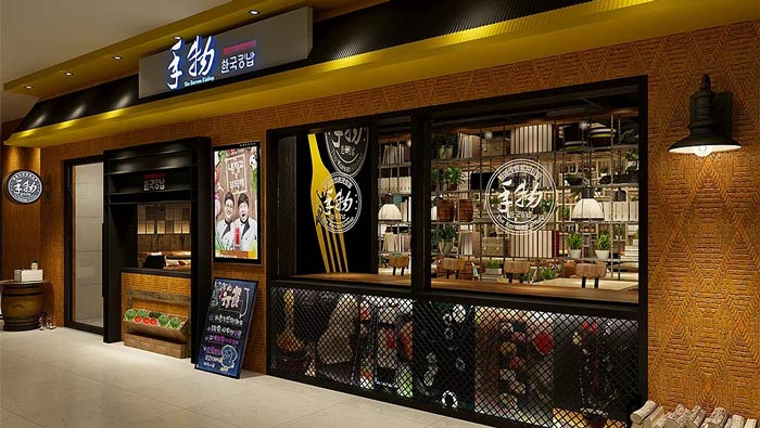 韓式主題餐廳門面設計:手物,是餐廳的名字,設計師利用各種各樣的形式,將其安置在不同的區域,讓客戶對餐廳有一個更加直觀的認識,讓企業的形得到全面展現。