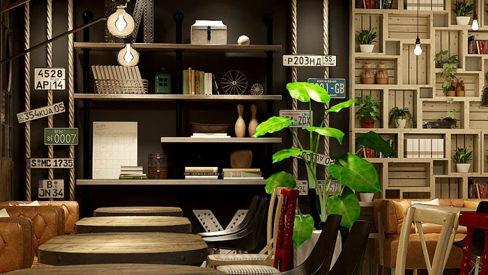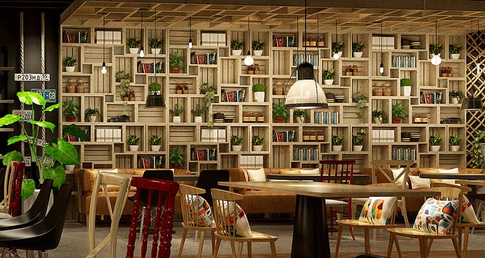 韓式主題餐廳裝飾墻設計:裝飾墻上擺放著各式各樣的裝飾品,其一是為了裝飾空間,其二是為了讓空間更加美麗,綠色的綠植擺放在裝飾墻上,讓空間變的美麗、自然。