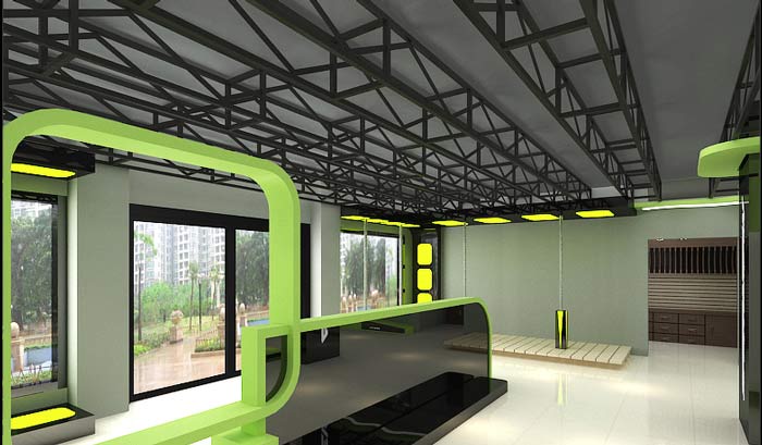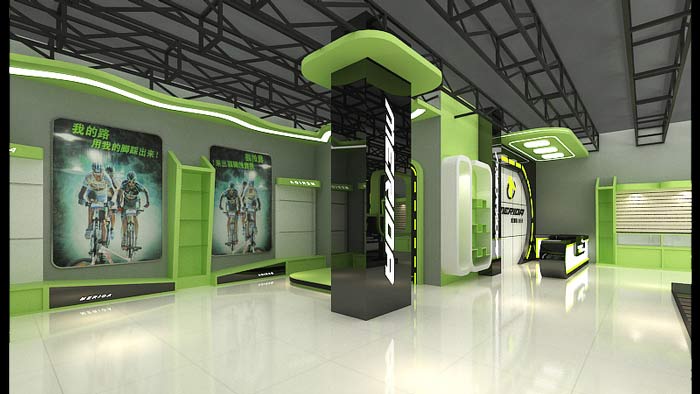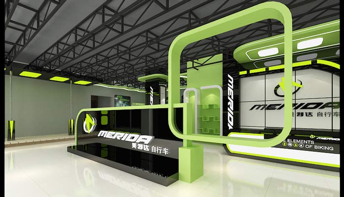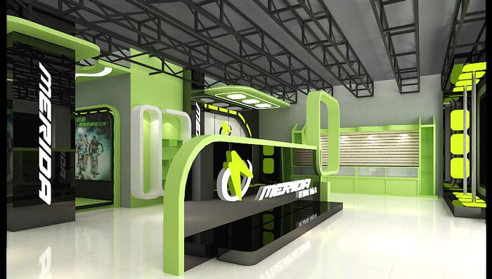 設計理念:設計師在美利達自行車專賣店裝修設計的時候,整體方案色彩以淡綠色和熒光綠的色調,造型以流線型和倒圓角的造型,在實用型和美觀型很有效果!