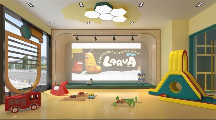 前臺區(qū)域的設計:設計師在設計之初,搜索了很多關于早教中心的案例,進行不斷的摸索與分析,同時一個歡快的空間氛圍也十分重要,其中爆笑蟲子的出現(xiàn),也體現(xiàn)了設計師對于孩子的期待,爆笑蟲子在設計師看來是一部充滿創(chuàng)意與樂趣的動畫,其中融合了音樂、節(jié)奏、豐富的肢體動作,以此培養(yǎng)孩子們樂觀向上上、相互陪伴的人生價值觀。