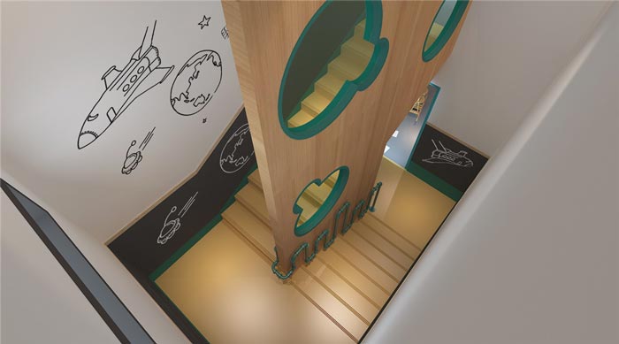 樓梯的設計:此樓梯非彼樓梯,此處樓梯是按照孩子們的比例進行改造的,孩子們可以輕松的上上下下,低于幼兒來說也是一個不錯的區(qū)域,孩子們通過不斷的努力不斷前行,最終走上二樓,這本身就是一種訓練,對于設計師來說整個空間都是一個挑戰(zhàn),讓孩子們不斷地成長。